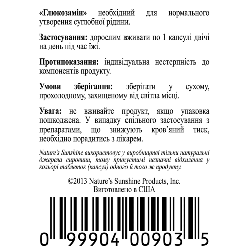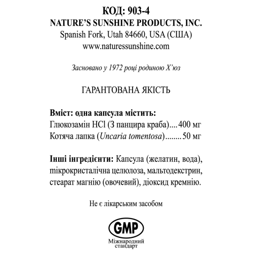Состав - 1 капсула: глюкозамин гидрохлорид (из панциря краба) - 400 мг (80% от АСП), кора ункарии волосистой (Uncaria tomentosa) - 50 мг.